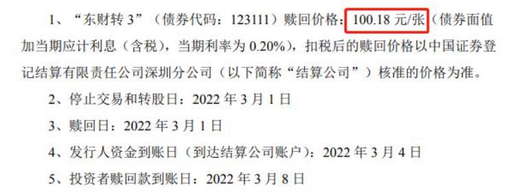 这个固定的价格被称为赎回价,基本上和可转债的面值(100元)相同,以东财转3为例,公告中的赎回价为100.18元。