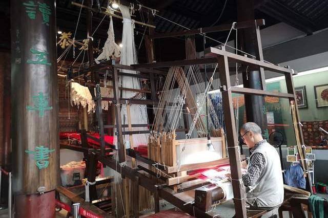 南京云锦织造技艺,是我国优秀文化的杰出代表,至今已有1580年历史,与成都的蜀锦、苏州的宋锦、广西的壮锦并称为“中国四大名锦”,是中国古代织锦工艺史上最后一座里程碑。两位年纪较长的师傅,在专心致志的演示。