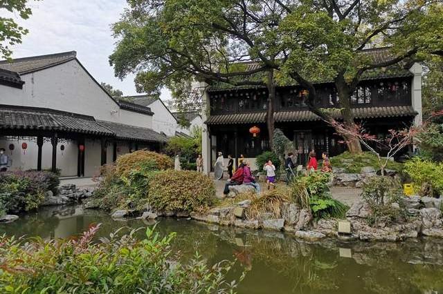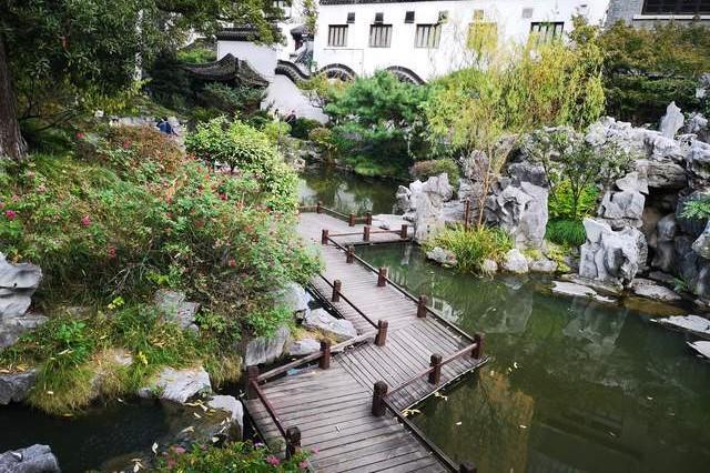津逮楼南侧为甘家后花园,假山奇石、栈道池水、别致的回廊,2007年复建的“小园”长廊和水榭,年轻的摄影师为一对情侣拍摄婚纱照。