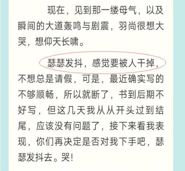 第二个原因:辰东:瑟瑟发抖,感觉要被人干掉一般,不想请假,但是没办法,必须要断更了。这个理由我感觉最奇葩了。辰东估计小说写多了之后拥有一个超能力了,能够预感别人对自己的恶意。的确那个时候很多读者都是想要找辰东“喝喝茶聊聊天”的,顺便刀片。