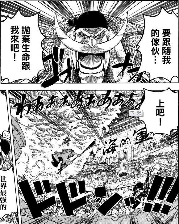 而摧毁了海军监视自己的二十三艘军舰,率领白胡子海贼团和麾下四十三搜来自新世界的海贼团对战海军本部十万精锐海兵、海军三大将等和王下七武海。