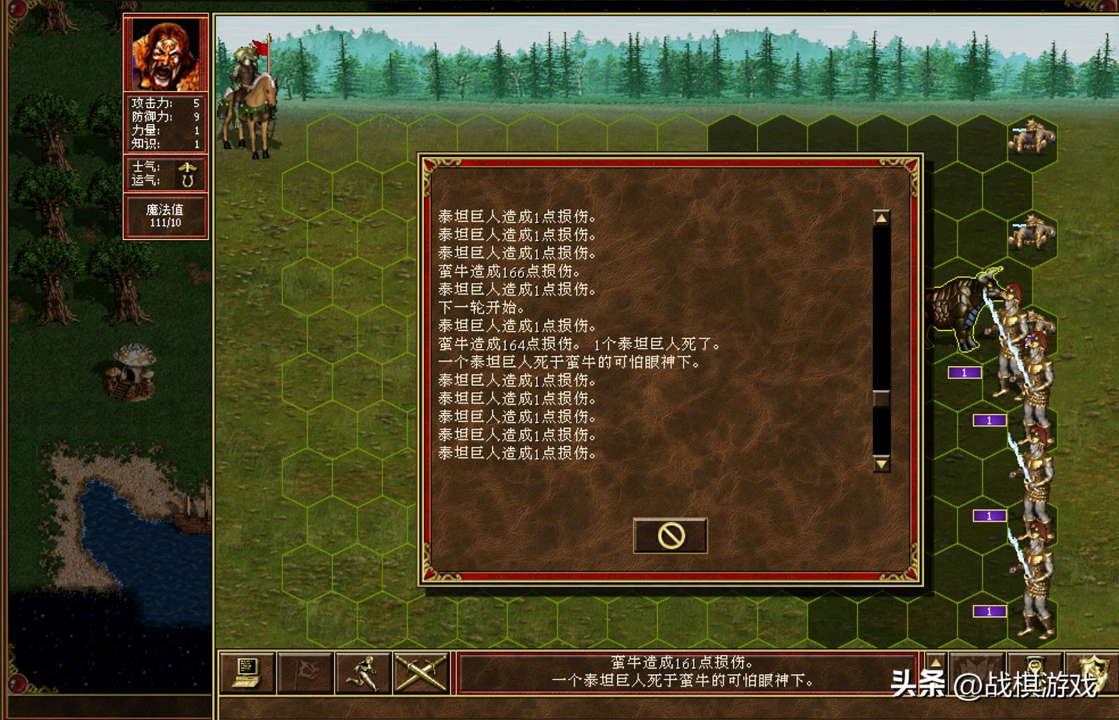 蛮牛攻击(或反击也一样)敌人部队以后,需要进行2次判断,第一次判断这次攻击的伤害是多少,如果本次伤害造成敌人死亡,也一样要计算死亡。第二次判断,判断死神之眼是否发动,以及发动以后对方部队死亡几个。见下图,蛮牛攻击了泰坦,先是攻击伤害杀死了一个泰坦,随后触发死神之眼,又杀死一个泰坦。