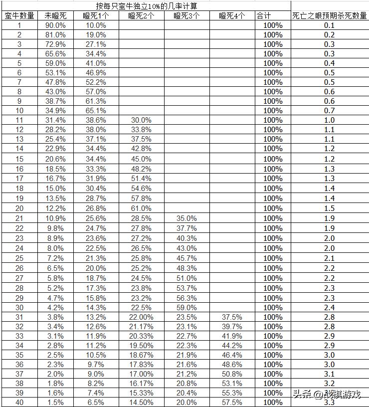 这里特别要指出的是,即使40只蛮牛,依然有极低的概率不发动死神之眼。只不过这个概率非常非常低,实战可能根本观察不到。