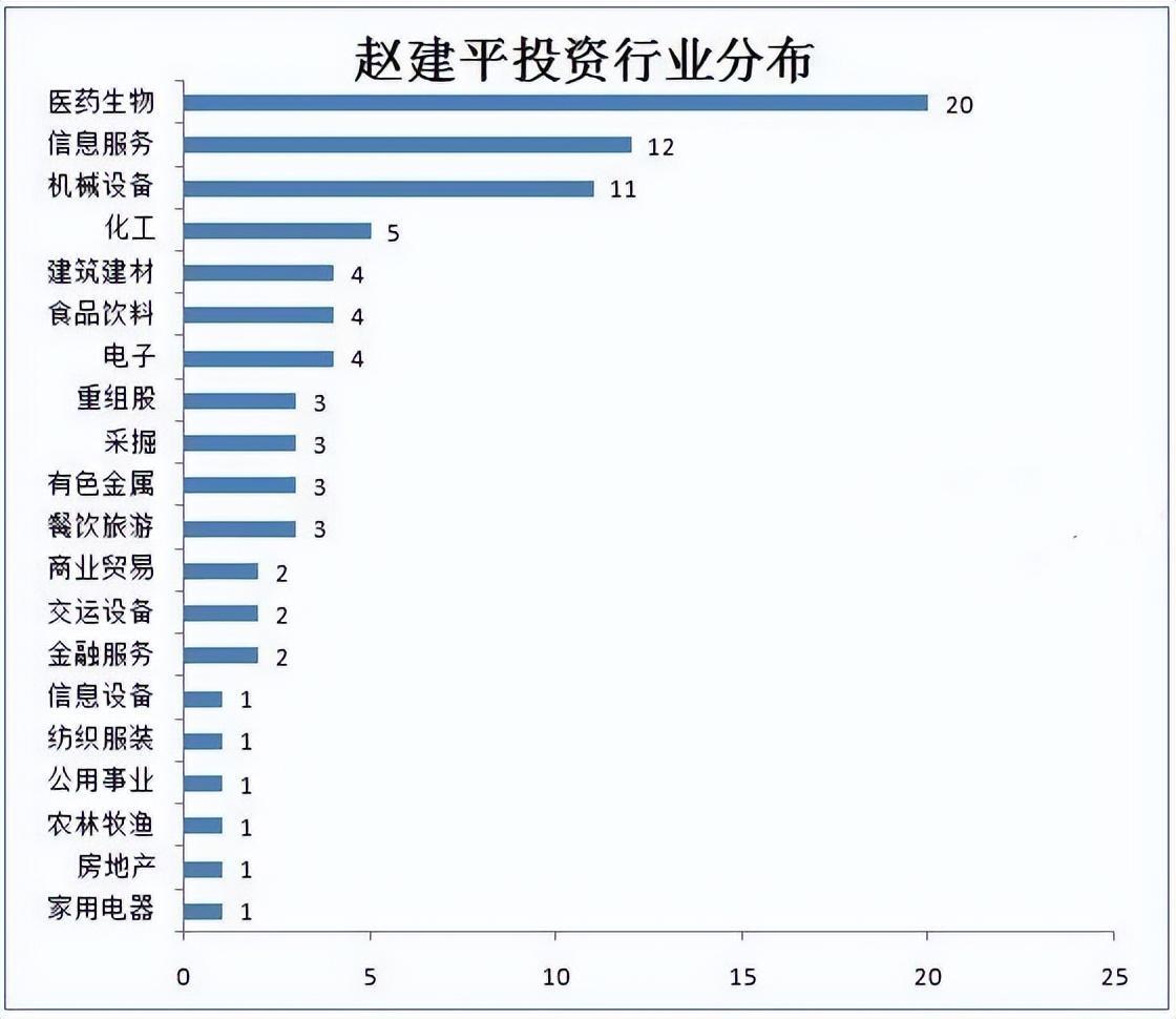 若回顾赵建平的历史持仓,我们可以统计到累计84家公司的行业分布,其中医药及医药设备行业最多,其次是信息服务和机械设备。