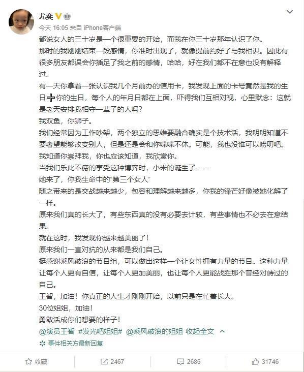 6月20号下午王智的老公尤奕,发长文向老婆王智深情告白。