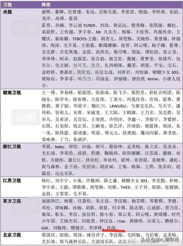 东方卫视:邓紫棋、迪丽热巴、杨紫、任嘉伦、朱正廷、邓伦、江疏影、贾乃亮、冯提莫、r1se、时代少年团、黄晓明、应采儿、陈小春、付辛博、檀健次、刘敏涛、李泽锋、郑云龙、阿云嘎、黄绮珊、胡歌、秦岚、靳东、钟汉良、那英、肖战等。
