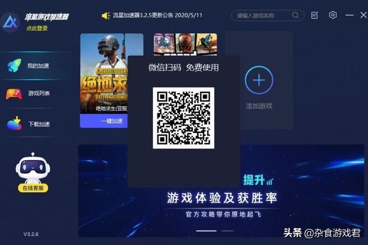 第二款是流星加速器,用过的都说好(大概),需要通过微信扫码登录。可以加速的游戏数量也很多,同样也支持加速外服游戏