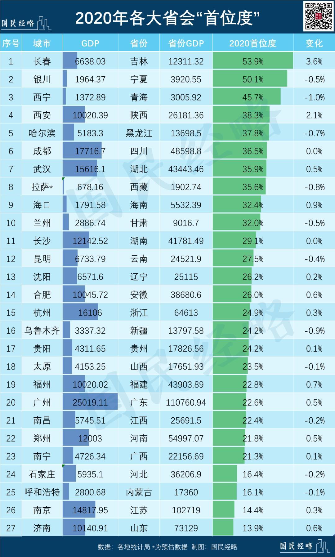 从省会GDP占全省GDP比例来看,有两个城市超过50%,分别是长春和银川。
