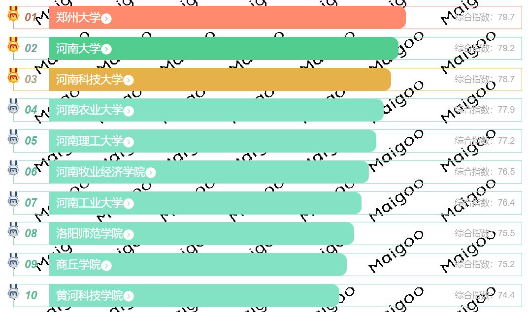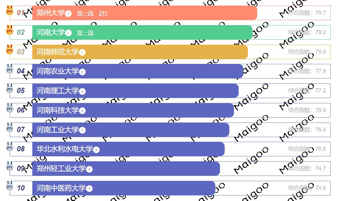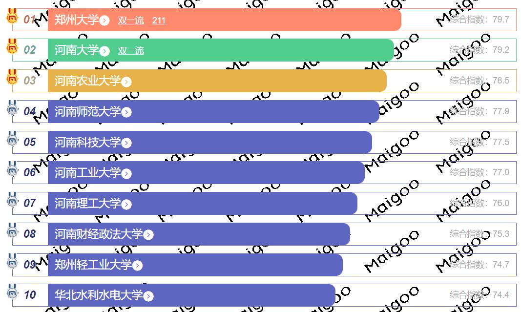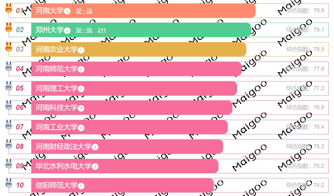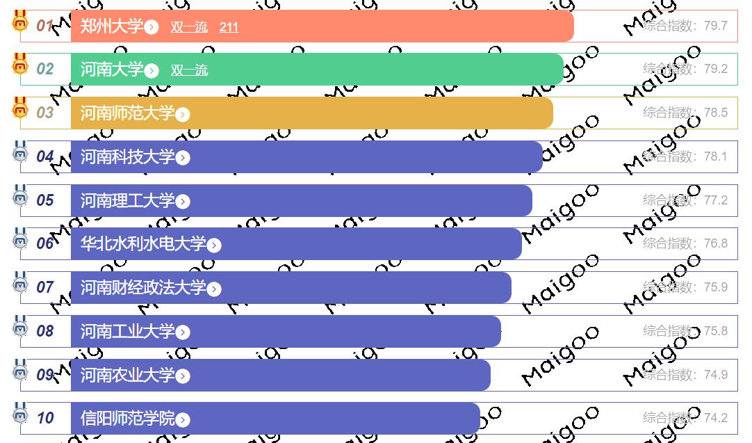 河南省综合实力最强的大学位列第一的是郑州大学,位列第二的是河南大学,位列第三的是河南农业大学。