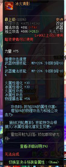 外观很炫酷,一把剑是蓝色,一把剑是红色。属性的话,冰火双属性加成,+20%属性伤害,+8%物理攻击力、独立攻击力,并且还会增加觉醒技能特效。