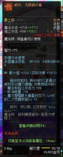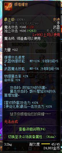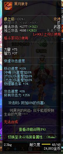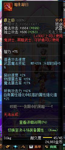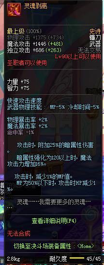 非常有特色的武器,放完技能之后很有可能自己就没血没蓝了。不过这把武器的伤害非常的强,+25%暗属性白字伤害,+16%魔攻。驱魔暗强堆不到120就放弃这个职业吧。灵魂,它需要灵魂..