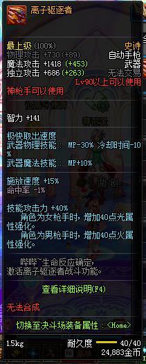 男女适用加成不一样,女枪+40光强,男枪+40火强。+40%的技能攻击力。如果有战神的话,可以一个切BUFF,一个用来打输出,伤害爆炸。