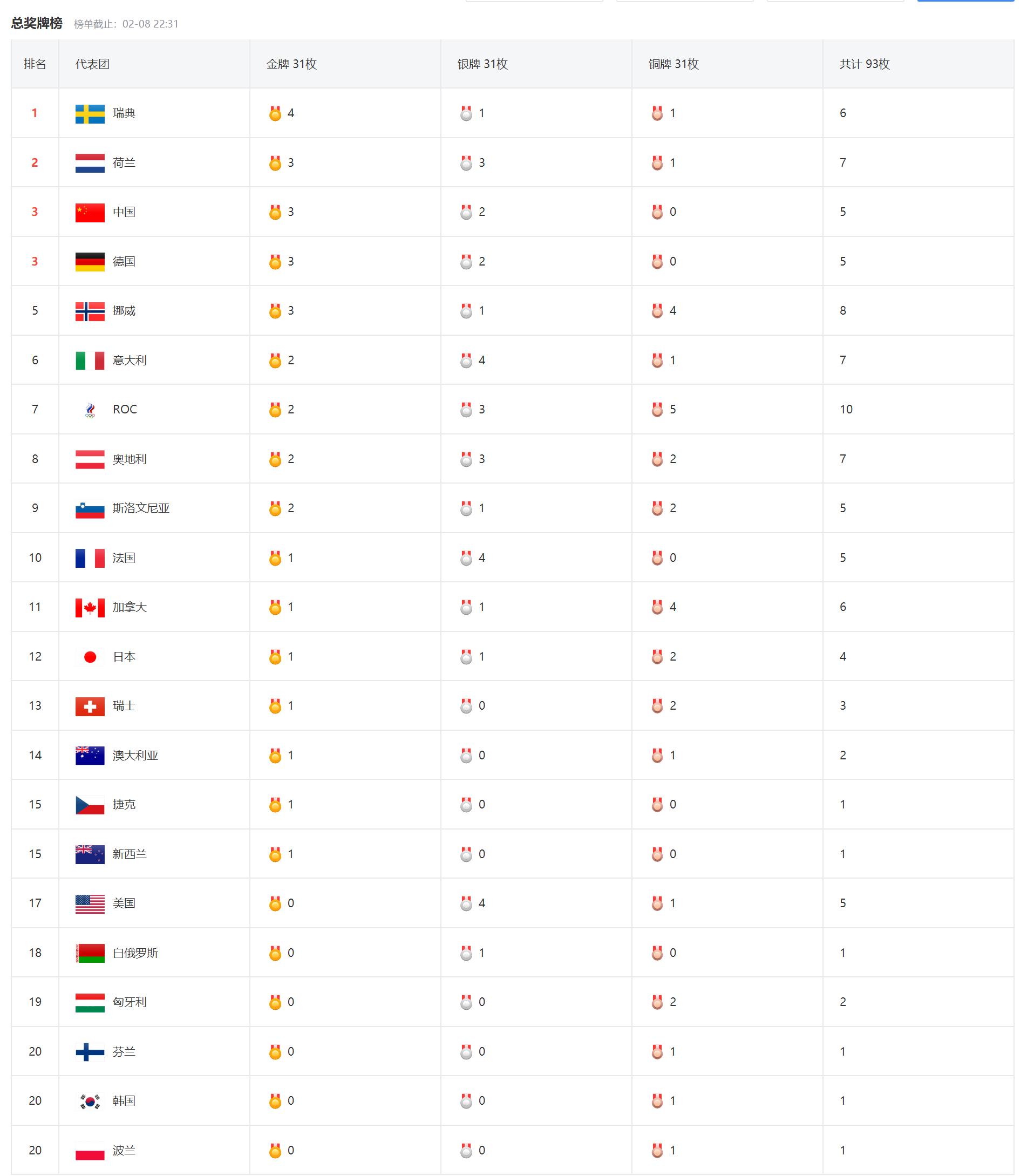 冬奥最新奖牌榜:瑞典队连续摘金稳居榜首,中国队升至第三