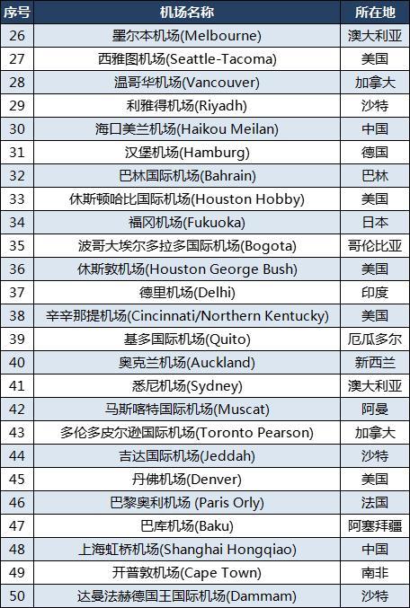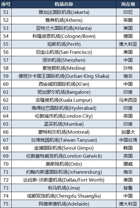 印尼雅加达国际机场排名第51位,希腊雅典机场排名第52位;