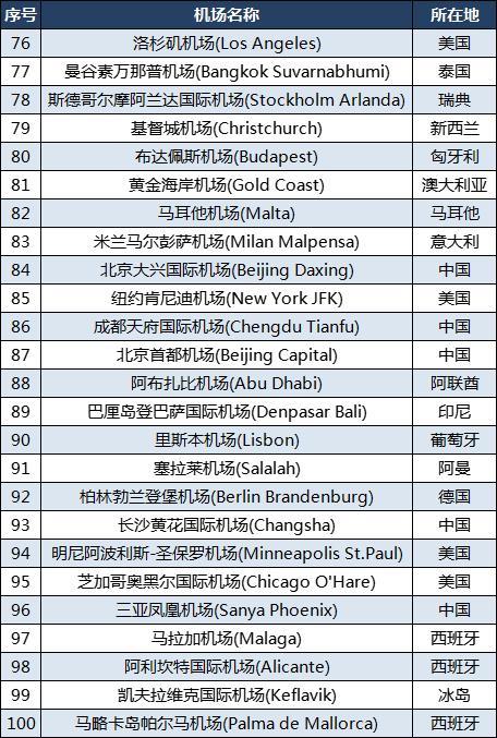 中国成都双流机场排名第74位,澳大利亚阿德莱德机场排名第75位;