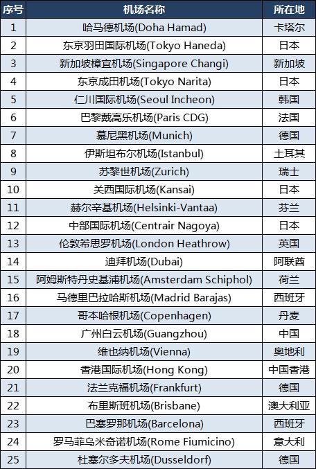 意大利罗马菲乌米奇诺机场排名第24位,德国杜塞尔多夫机场排名第25位;