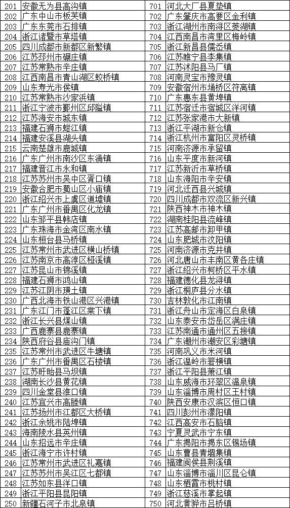 千强榜单中江苏省共有204个镇上榜,浙江省共有161个镇上榜,广东省共有120个镇上榜,山东共有112个镇上榜,河北省共有57个镇上榜,福建省共有51个镇上榜,河南省上共有43个镇上榜,安徽省共有30个镇上榜,四川省共有25个镇上榜,湖北省有29个镇上榜。