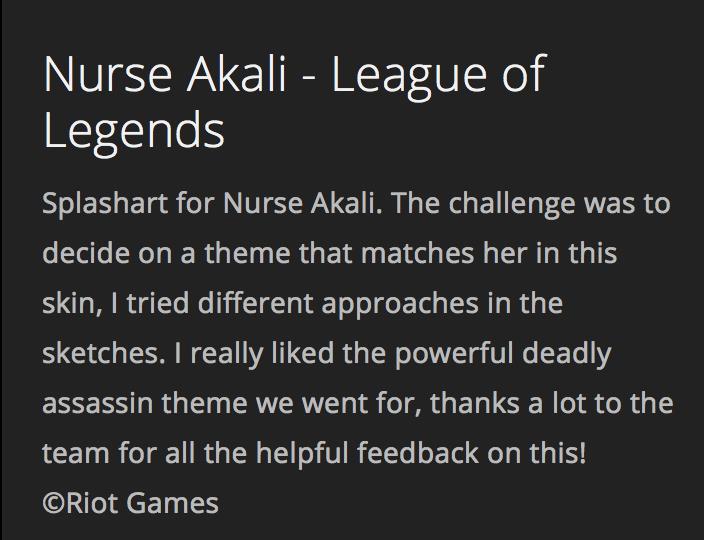 这是实习护士阿卡丽的皮肤原画。决定一个与她相匹配的皮肤主题的确是一个挑战,我在草稿中尝试了很多不同的方法。我真的很喜欢我们所追求的强大的致命刺客的主题,感谢我的团队为此提供的所有有帮助的反馈建议!