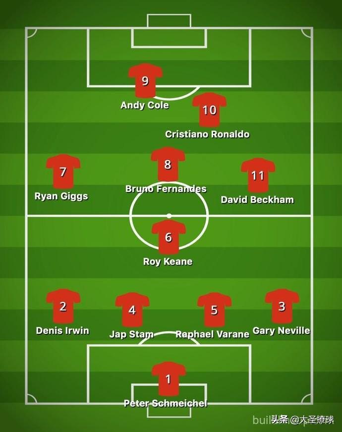 右前卫 - 贝克汉姆中前卫 - 罗伊-基恩中前卫 - B费左前卫 - 吉格斯射手 - C罗射手 - 安迪-科尔