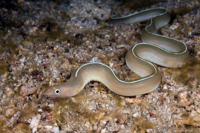 海鳝科是80多种鳗类的统称。分布于热带和亚热带海洋,生活于浅水。它们一般躲藏在礁石的缝隙里,伺机捕食。海鳝有着一张大嘴和锋利的牙齿,它们以海洋生物为食。不过,如果有人类离它们太近,也会遭到它们的攻击。