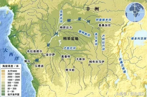 从刚果盆地位置示意图中,我们可以依据经纬度、板块和相对地理事物来描述刚果盆地的位置。从图中我们可以发现: