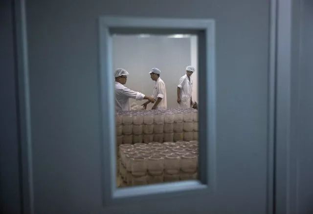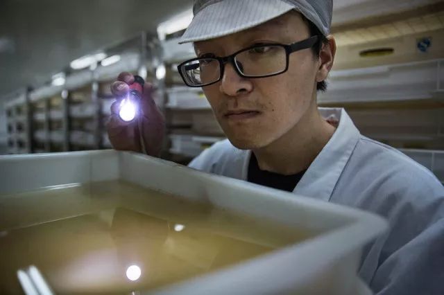 图中一位试验室处事职员正把洪量的蛹变化到更大的容器中。