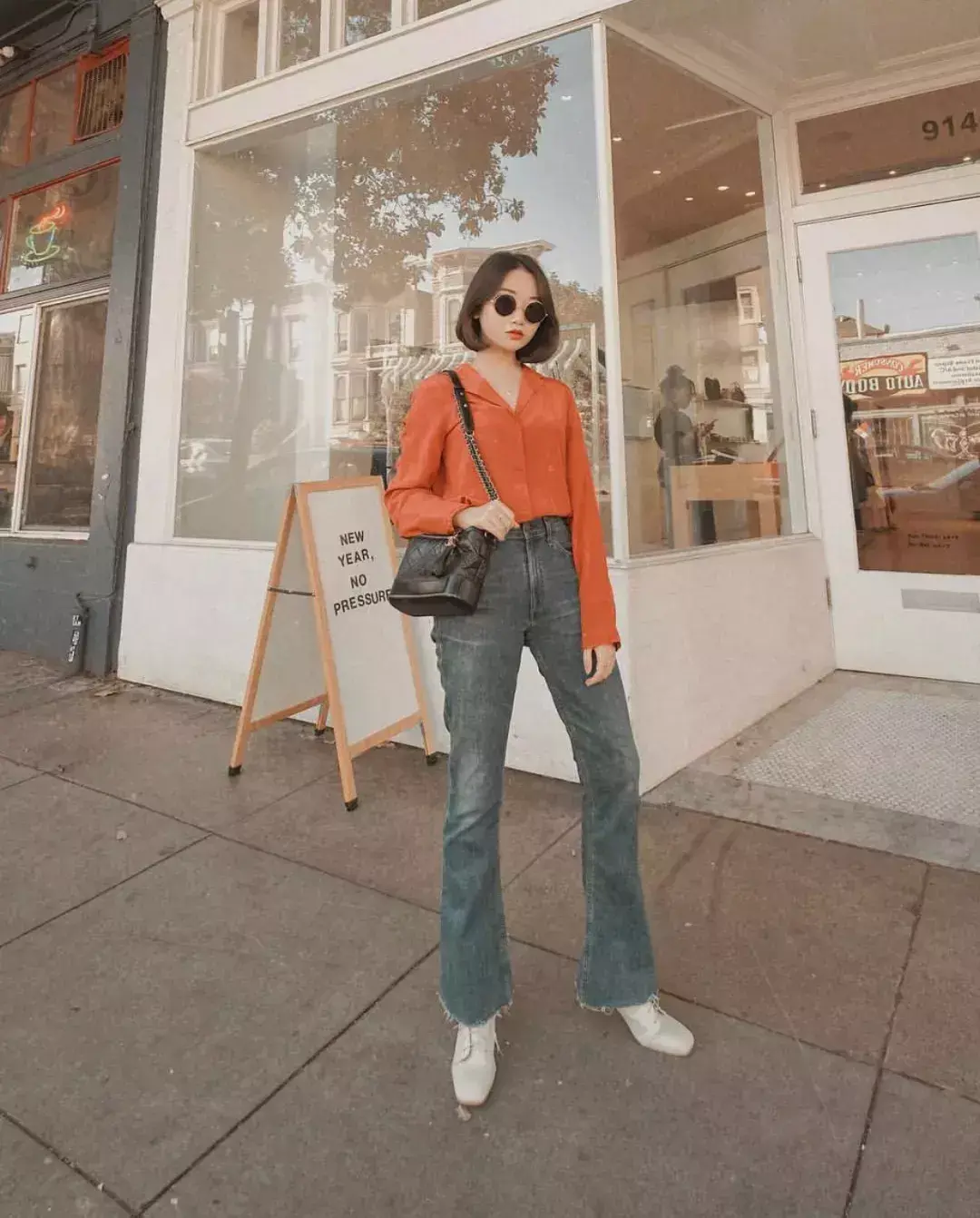 丝绸质感的脏橘色衬衫看上去就很“贵”,搭配牛仔喇叭裤和高跟皮鞋,延续了vintage的复古风,非常适合职场的仙女。