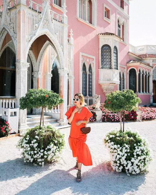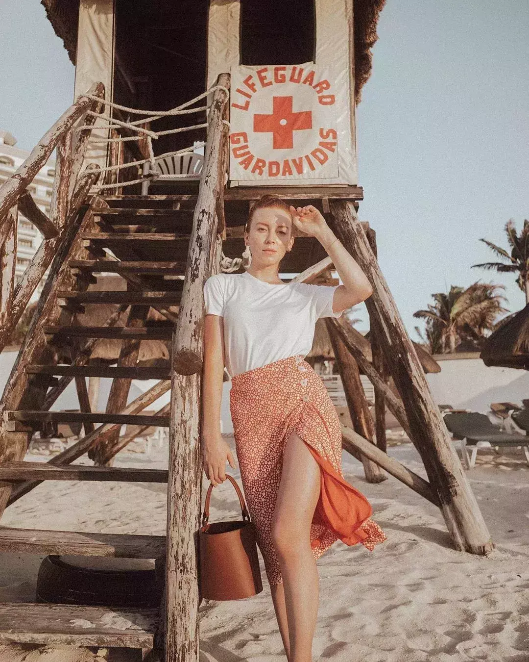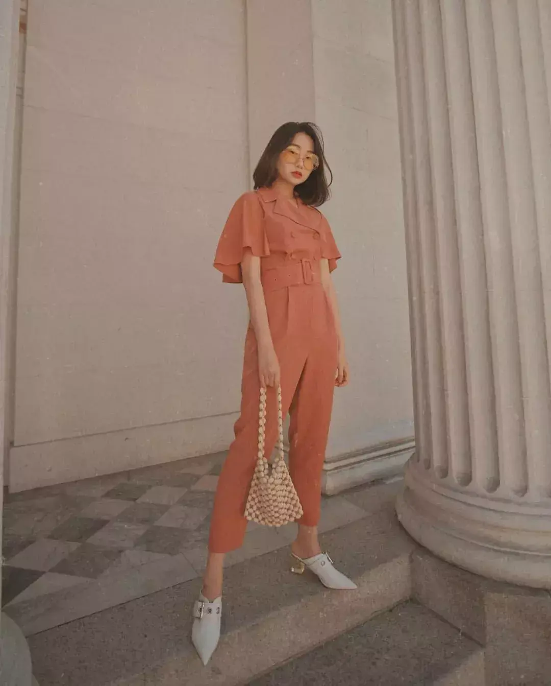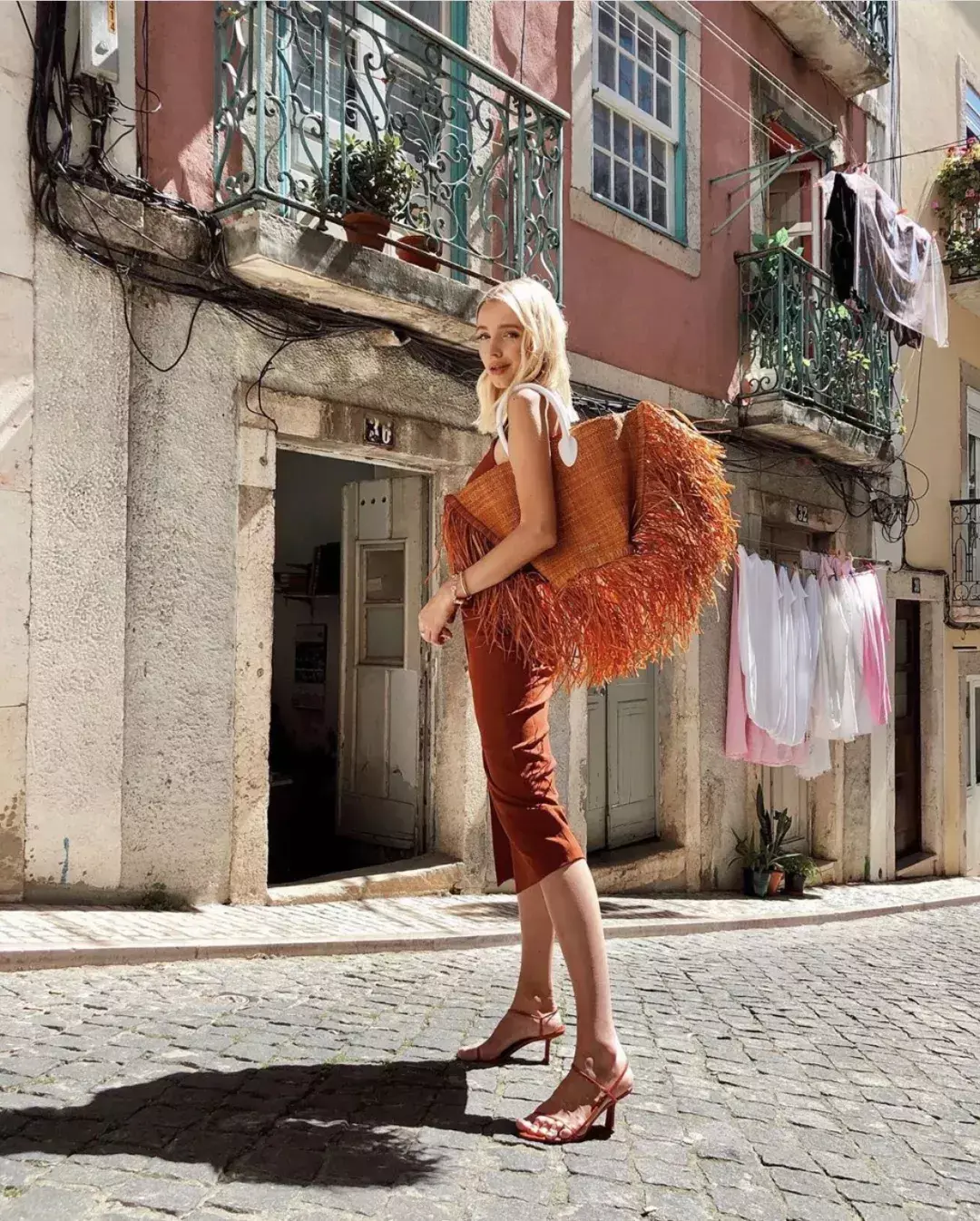 脏橘色的吊带裙搭配同色系的藤编包、高跟凉鞋,这身look非常大胆,仙女们出游的时候不妨挑战一下!