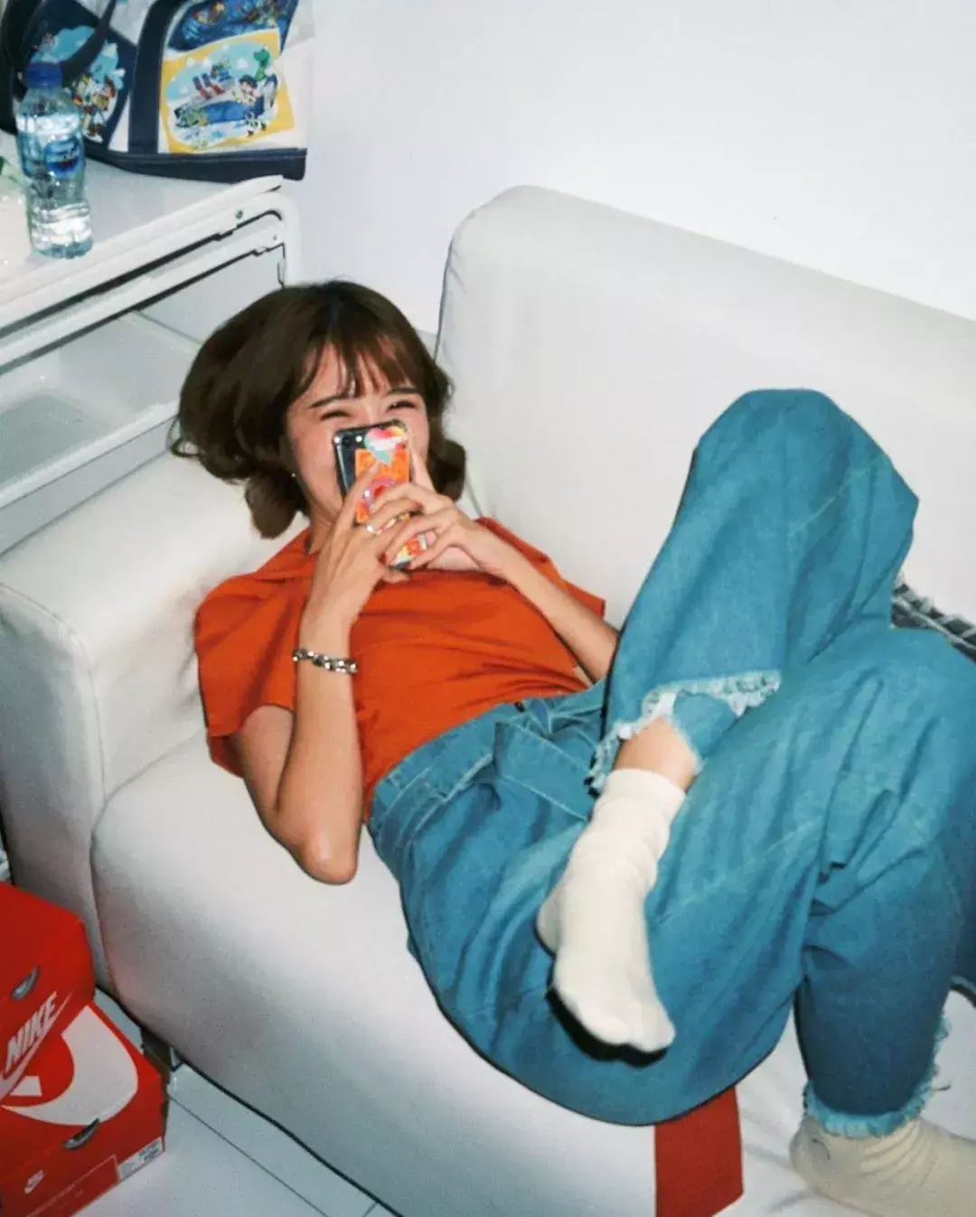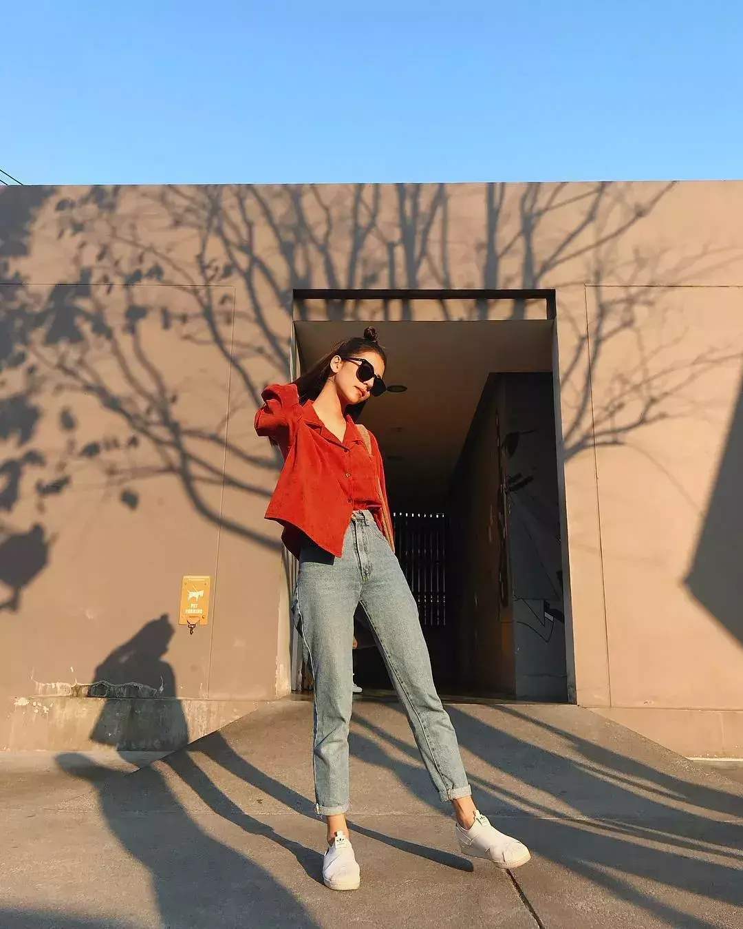 偏红色调多一些的脏橘色衬衫比起一般的白衬衫亮眼不少,给整体看上去比较简单的浅色牛仔九分裤、小白鞋搭配,加分许多。