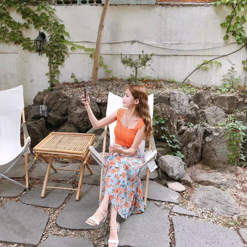 心形领的宽肩带脏橘色上衣,搭配碎花迷笛裙,知性又优雅,有种邻家小姐姐的亲切感。