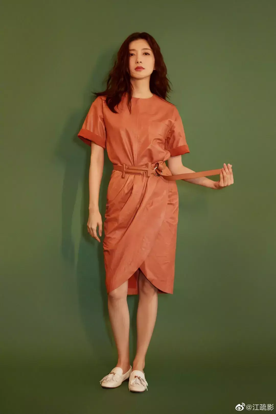 江疏影这条脏橘色的皮质连衣裙也是美到没朋友,开叉和腰带的设计都非常夺人眼球,不得不说,衣品在线!