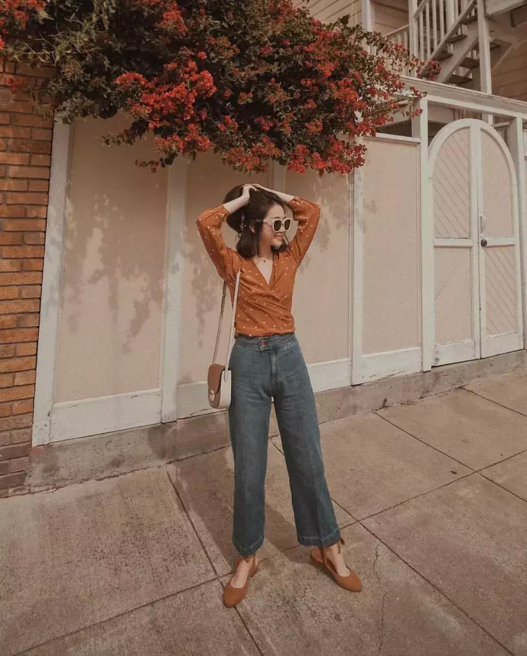 明度低一些的脏橘色,配上波点和V领,复古意味更浓,搭配牛仔阔腿裤、同色系的奶奶鞋,十分出彩,这样的时髦小心机iget到了嘛!