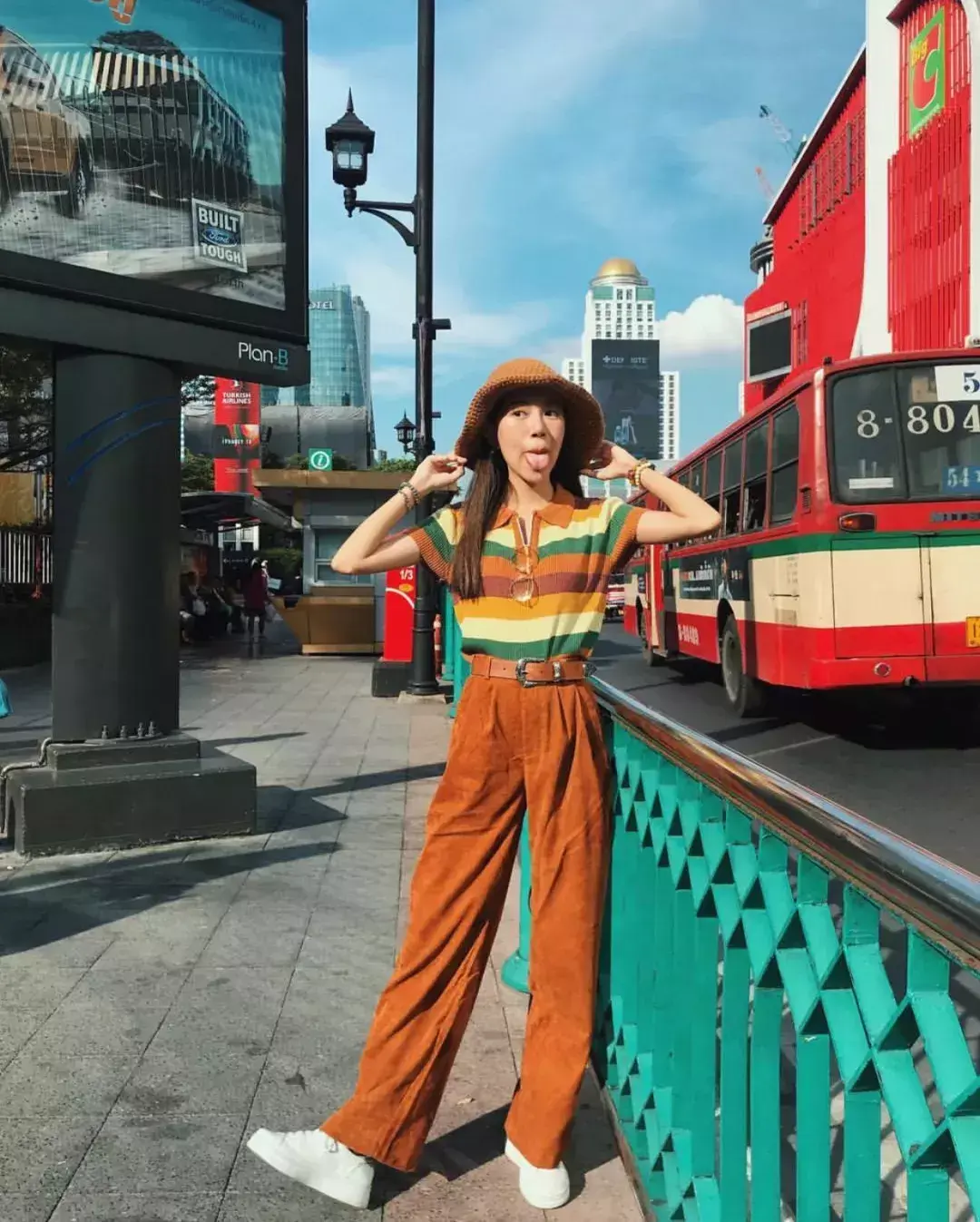 很多仙女都会担心脏橘色显黑,但其实只要不是特别亮的脏橘色系对黑黄皮还是比较友好 ,或者让脏橘色远离你的脸部,选择下半身的搭配,就会好很多。