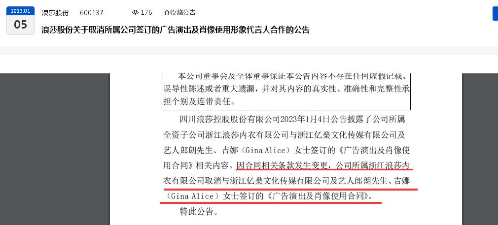 然而,1天后,即1月5日,浪莎股份披露《关于取消所属公司签订的广告演出及肖像使用形象代言人合作的公告》,称,因合同相关条款发生变更,公司所属浙江浪莎内衣有限公司取消与浙江亿燊文化传媒有限公司及艺人郎朗先生、吉娜(Gina Alice)女士签订的《广告演出及肖像使用合同》。