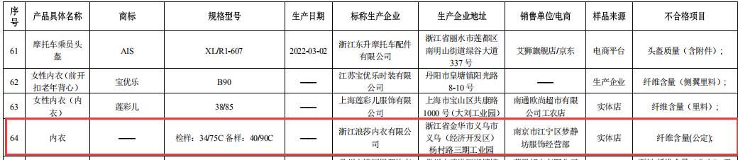 而这些不合格内衣品牌中,包括浪莎股份旗下全资子公司浙江浪莎内衣有限公司生产的内衣,不合格项目显示为“纤维含量(公定)”。