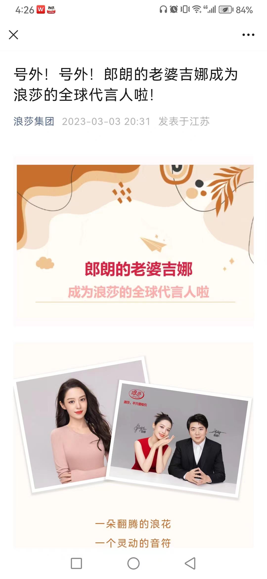 不过,笔者发现,公众号《浪莎集团》今年3月3日官宣:郎朗的老婆吉娜成为浪莎的全球代言人。与今年1月初的同时签约两人(随后取消)形成鲜明对比,那么,前后的广告费用又是多少?此举又意欲如何?为何没有以公告披露的形式,在上交所、巨潮资讯网上进行相关披露?值得关注。