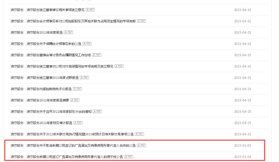 然而,根据巨潮资讯网,浪莎股份除了此前披露取消该两名艺人的代言公告后,并未再披露恢复相关代言的公告。