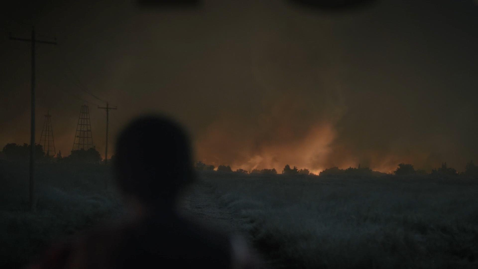 夜幕下男孩回望城镇,滔天的火焰映得远方的天际宛如血海一般。