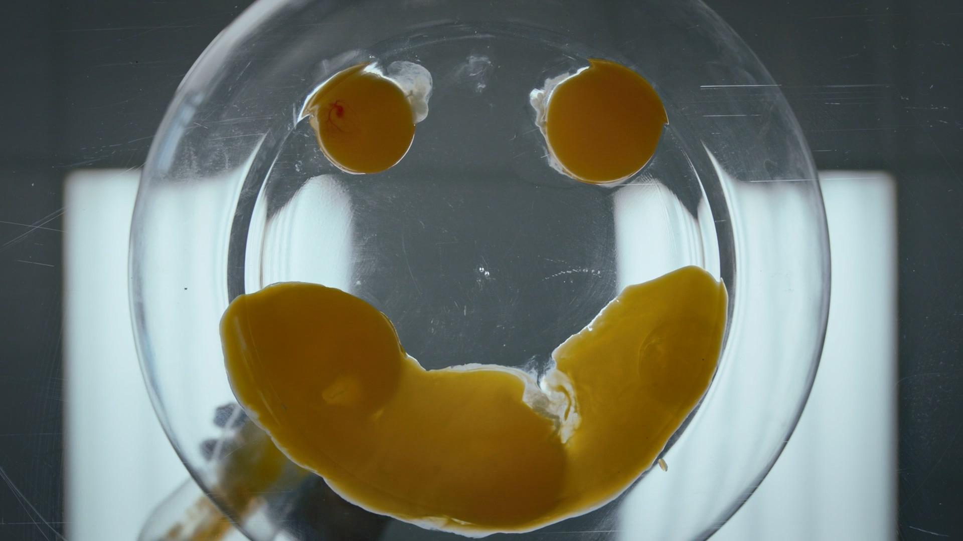 在她手中的玻璃盆中,被打散的蛋黄出现了经典的笑脸形状,笑脸的左眼位置还粘上了一丝血迹。