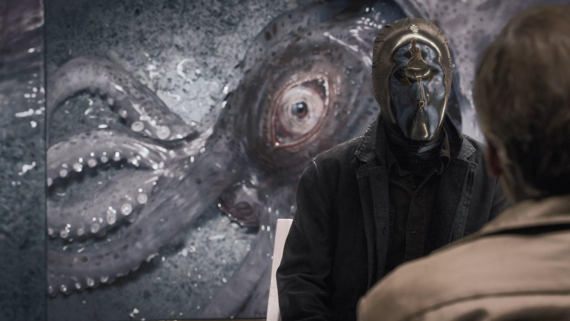片刻后天空放晴,安吉拉熟练地把车挡风清理干净,而乌贼留下的墨迹,让人不得不联想到罗夏的面具。