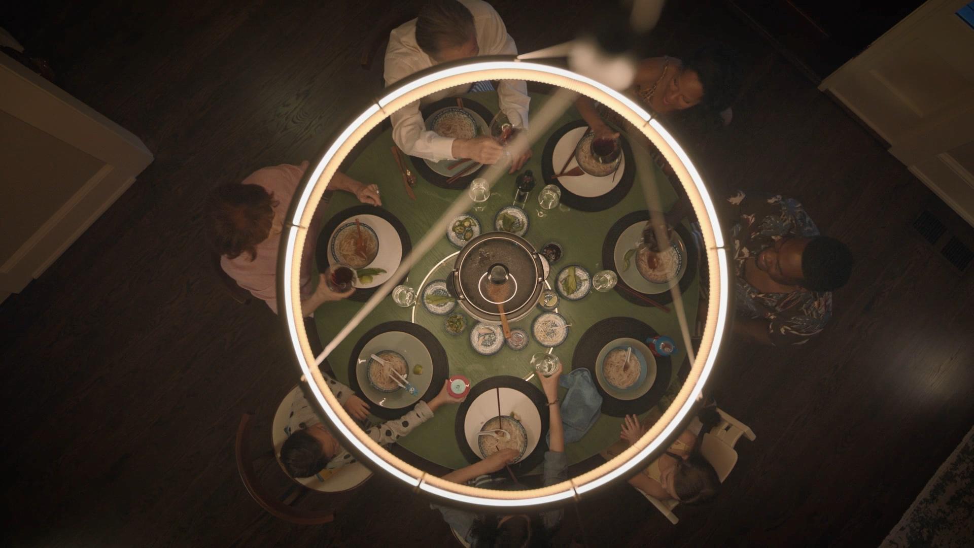 局长来到安吉拉家中做客,餐桌的俯拍就是钟表的模样,回看剧集海报安吉拉背后也是一个黄色的钟表。