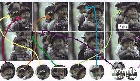 可是,第三个镜头的主角前面是第六个人(戴了白帽子),后面却是第七个人(单辫子的小女孩)。那么,这个孩子是哪里来的?难道图片中把他遮住了,没有显示出来?
