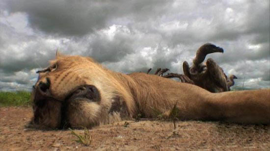 这是最小、最孱弱的秃鹫——头巾兀鹫。此时,它们正在四处溜达。它们的喙比较纤弱,力道较小,无法啄穿兽皮。它们只能啄食零碎肉块和其他秃鹫吃剩的东西。短短几个小时,这些秃鹫就会把狮子的尸体啄食得一干二净,尸体还没来得及腐烂。