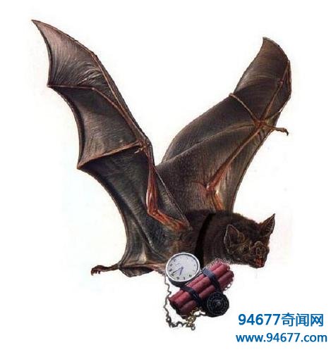 科学家的确是疯狂的人。第二次世界大战期间,美国正在进行一项训练轰炸日本人的蝙蝠项目。牙医小亚当斯(Little Adams)在1942年向白宫提出这个想法后,参观了新墨西哥州拥有蝙蝠的洞穴。他想到将动物与迷你爆炸物绑在一起,并用它们的回声定位来达到自己的目的。日本的松蝙蝠会主要躲在木制建筑的角落,挤占城市,之后炸弹就会开始启动。