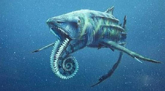 太陆鲨的前齿形成一个螺旋,约有180多颗,每个单齿由根部上直立的三角形冠组成,太陆鲨化石最早出现在二叠纪早期,是生活于中等水深中的肉食性动物。