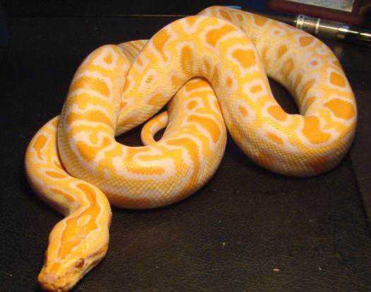 黄金蟒属于国家一级保护动物,是一种十分少见的变异,品种属于缅甸蛇的白化变种,体长大约7米左右,主要分布在印度、斯里兰卡、缅甸、泰国北部。