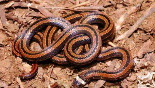 丽纹蛇也叫环纹赤蛇,是一种有剧毒的毒蛇,它释放出来的毒素是属于神经毒素,对人类的神经伤害很大,属于小型蛇类。但确实颜值很高的一种蛇。