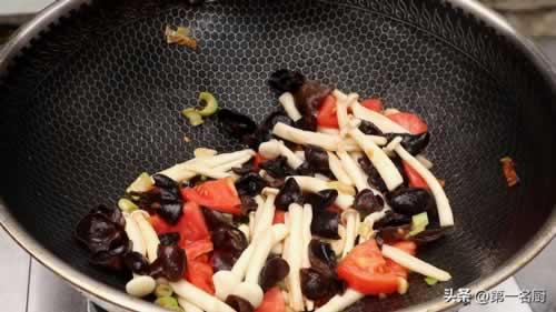 4.再次起锅添入少许食用油,放入葱蒜爆香,炒出香味后倒入西红柿翻炒,炒出汁水,下入木耳和白玉菇,快速翻炒几下,开始调味。