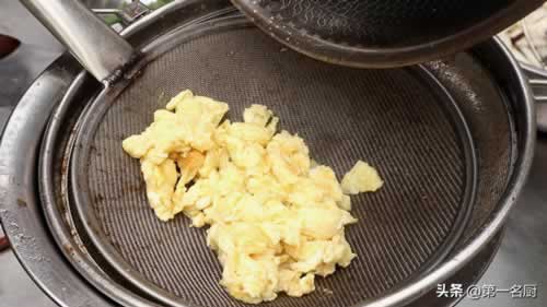 3.重新起锅添入少许食用油,油热后倒入鸡蛋液,简单翻炒几下,把鸡蛋炒熟以后,倒入漏勺中控油。