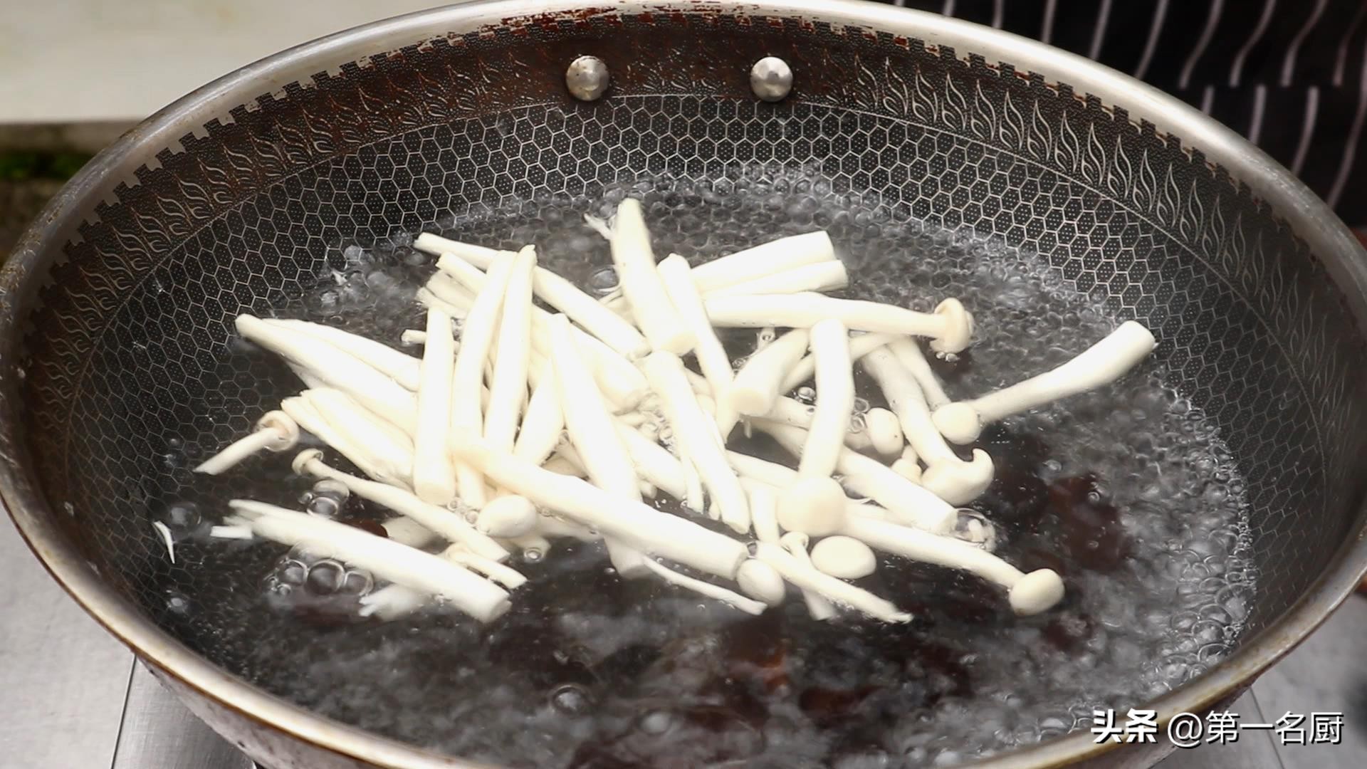 2.锅中添入适量的清水,水开后下入木耳和白玉菇,焯水一分钟左右,捞出控水放入盆中。